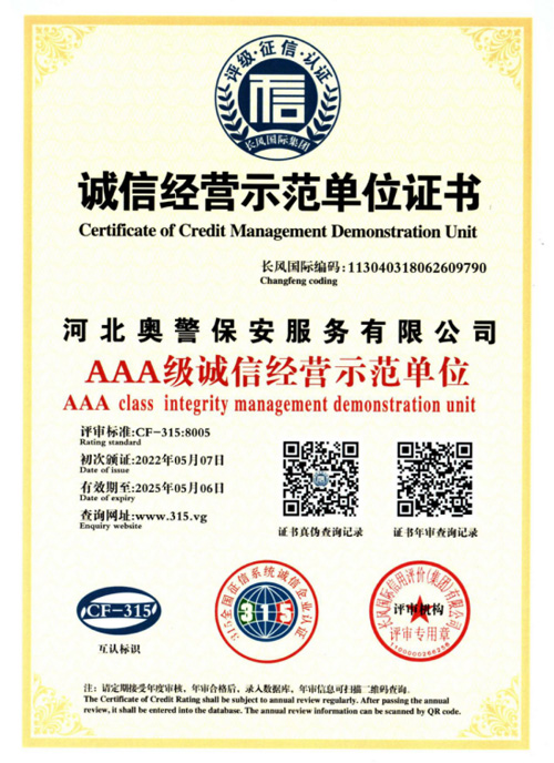 河北奧警保安服務(wù)有限公司成立于2017年7月20日,注冊資金1000萬元,具有中華人民共和國《保安服務(wù)許可證》(編號:冀公保服20180085)的綜合性安保企業(yè)。